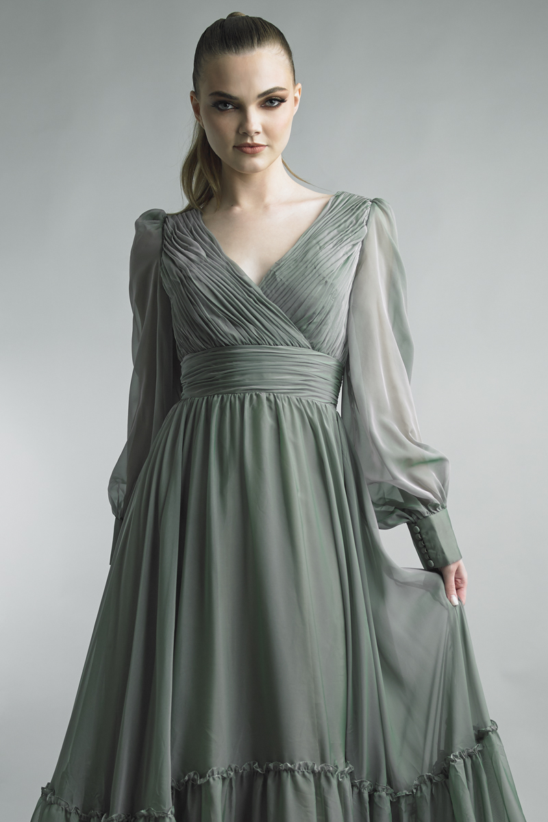 RUCHED V-NECK TIERED TULLE GOWN