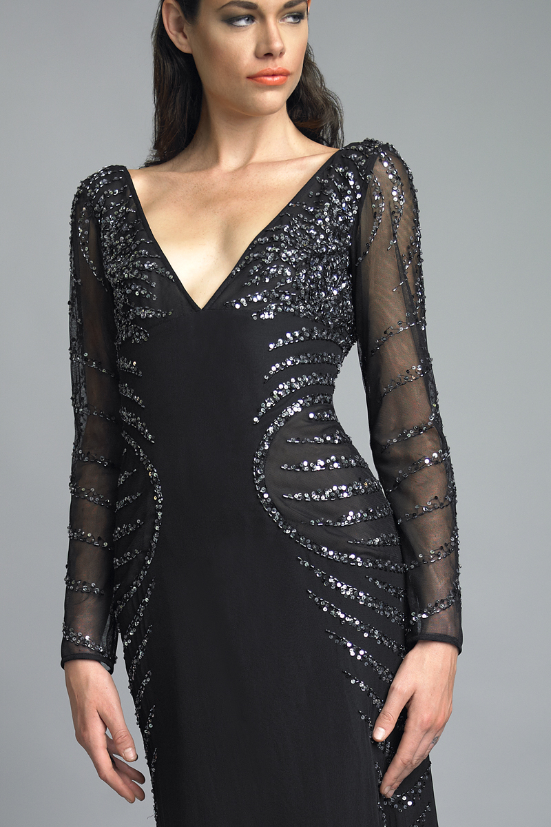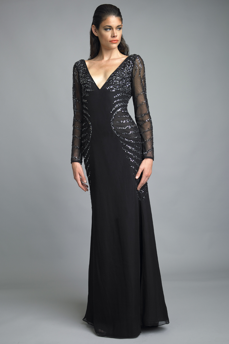 v neck gown with long sleeves and sequin detail