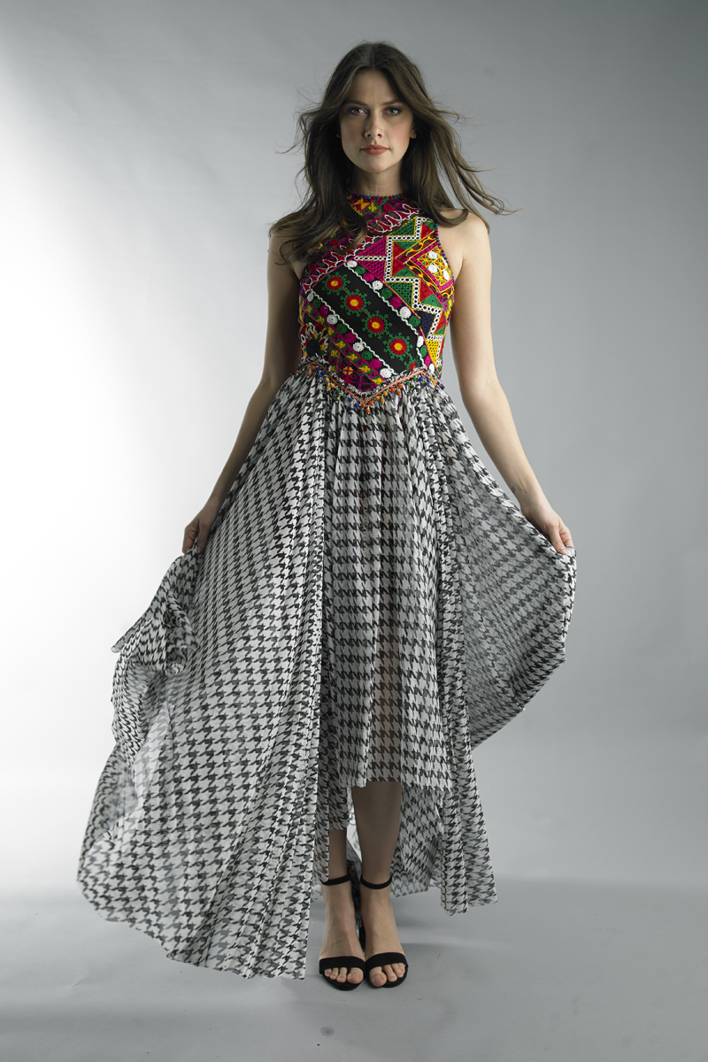 uneven skirt and sleeveless top gown multi color motif on top and print skirt