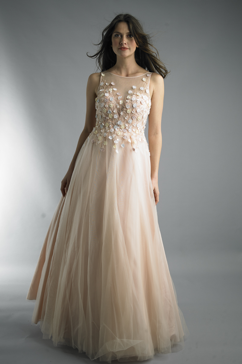 SLEEVELESS EVENING GOWN WITH FLORAL ACCENTS