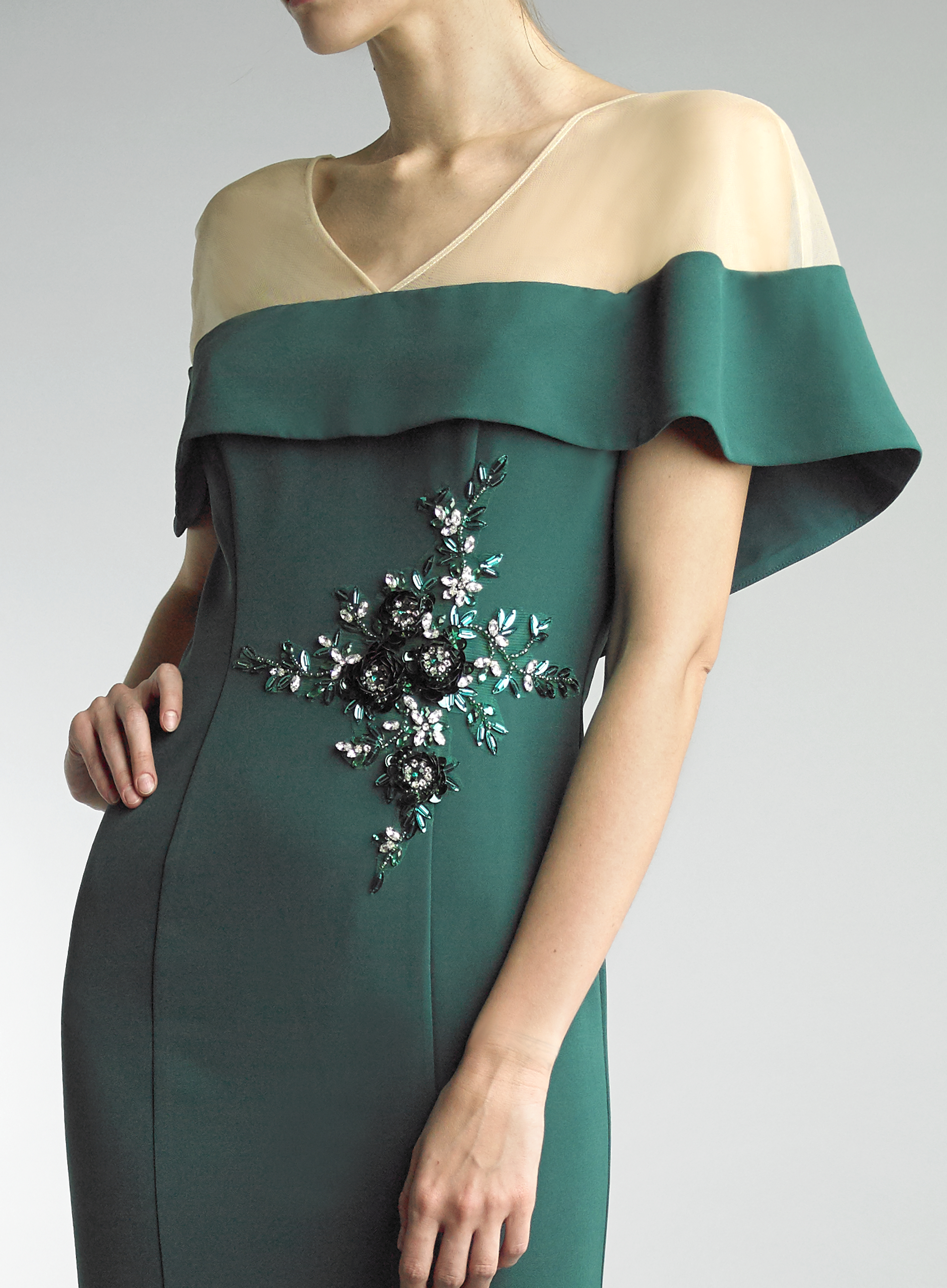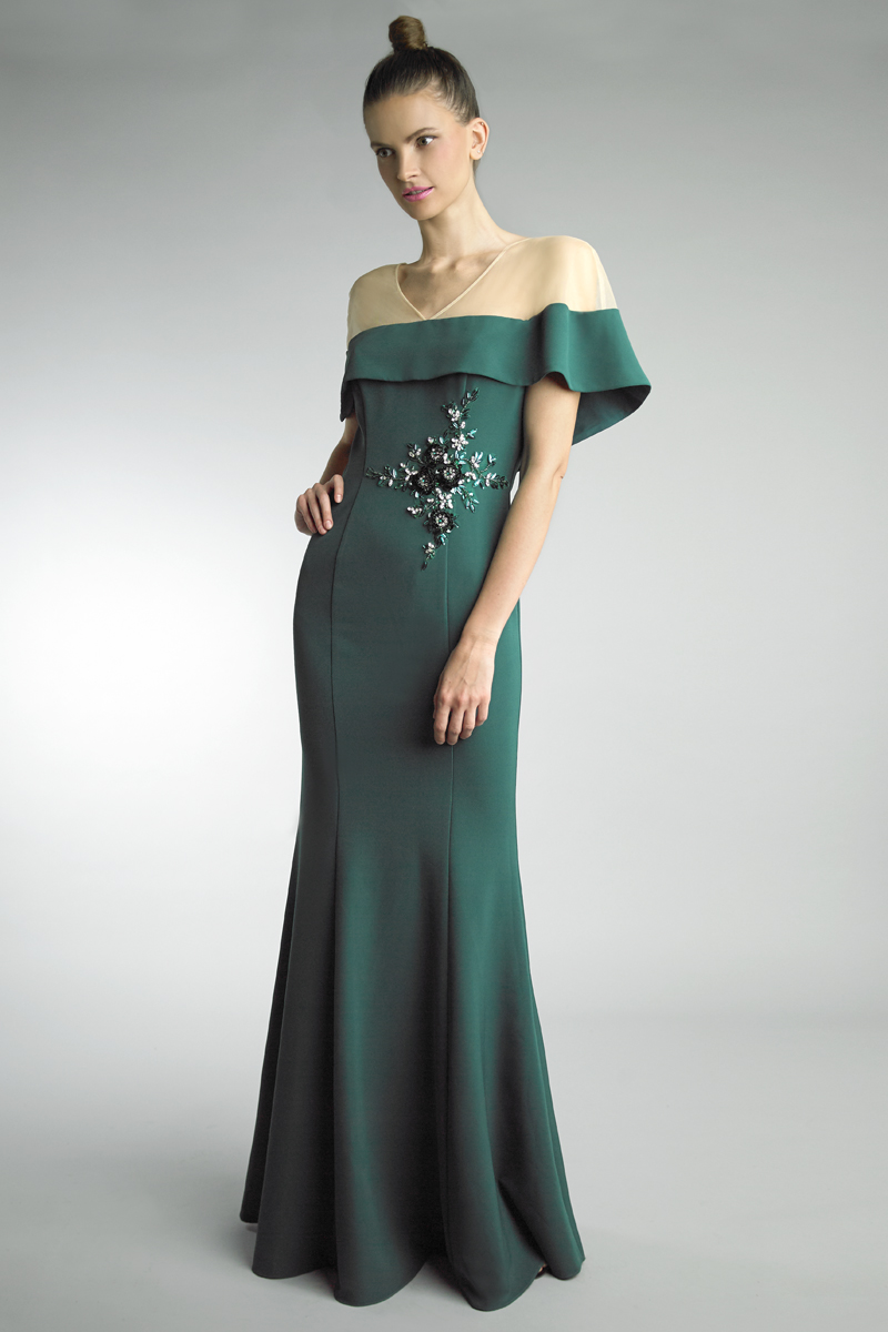 V NECK EVENING GOWN WITH FLORAL MOTIF