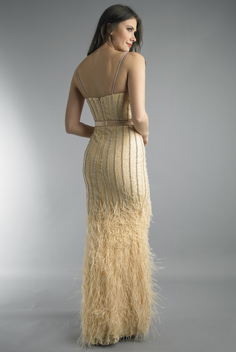 D9923L spaghetti strap gown with feather accent $895.00 $295.00 $395.00 (≈% OFF)
