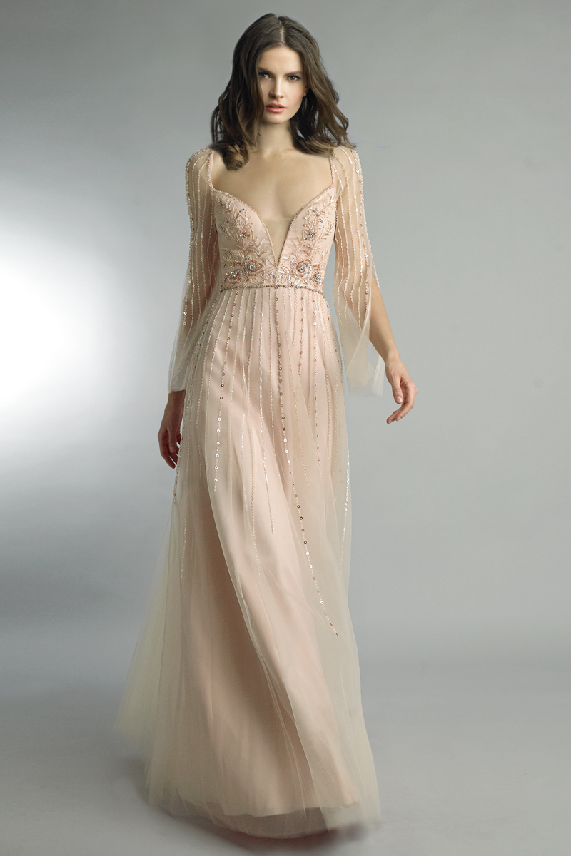 D8334L Beaded Mock Neck Long Sleeve Sheer Yoke Gown in lightweight fabric $695.00 $295.00 $245.00 (≈% OFF)