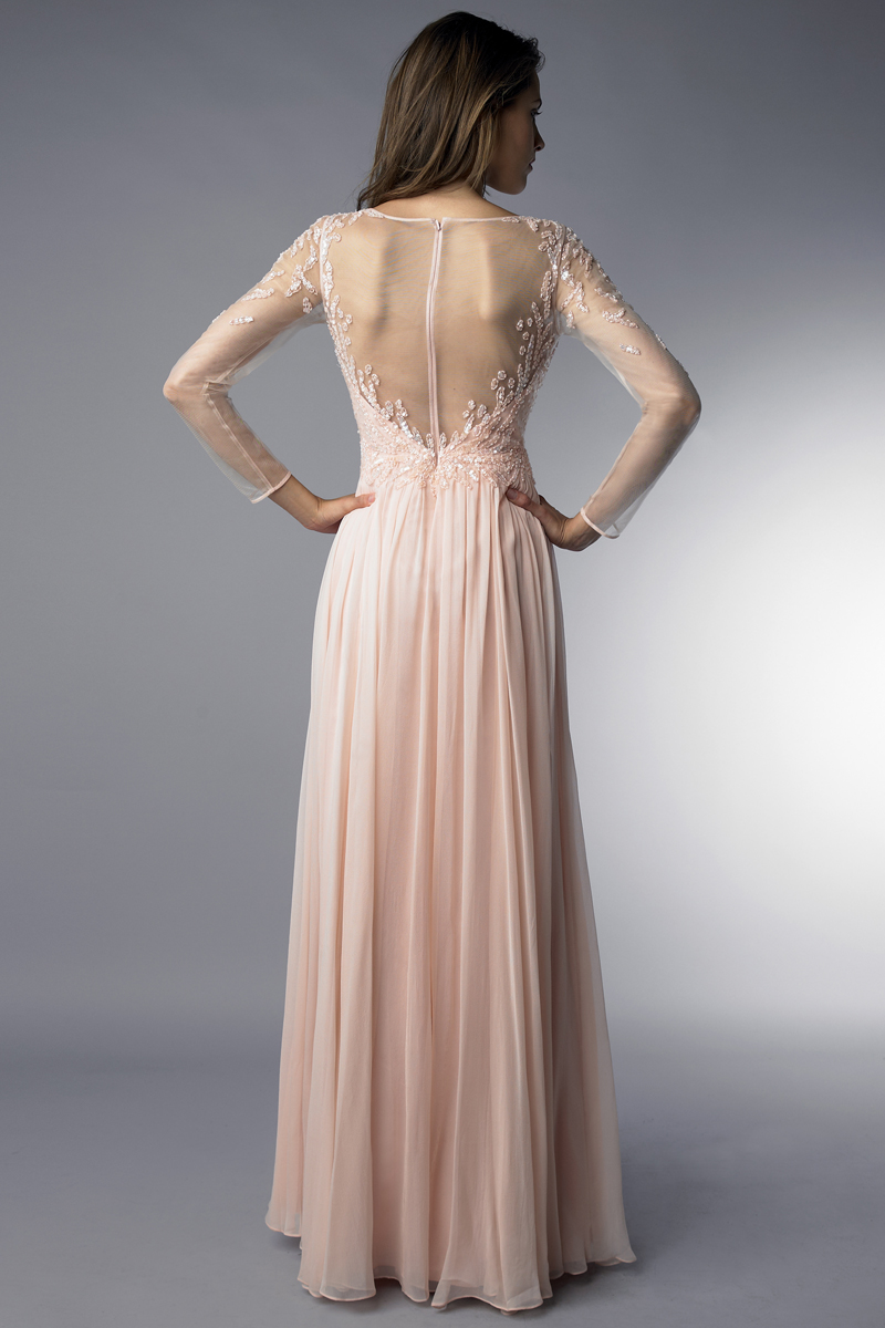D8334L Beaded Mock Neck Long Sleeve Sheer Yoke Gown in lightweight fabric $695.00 $295.00 $245.00 (≈% OFF)